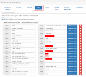 AD running AND obs recording management instructions: Simply add your twitch login name as Value under the LOGIN_TWITCH variable. Also add a password under Value for the VNC_PASSWORD field. This will be you VNC password to connect to the device. You will also need to fill in the following fields with appropriate values: HOST - IP of the machine OBS is running on. This machine will need the obs-websocket plugin installed into OBS. OBS_INSTANCES - Will you be managing 1 or 2 instances of OBS. 1 is default. OBS_WEBSOCKET_PORT_1 - OBS websocket port. default as obs-websocket sets is 4444. OBS_WEBSOCKET_PORT_2 - OBS websocket port. Only required if managing two instances of OBS. MUST be different from OBS_WEBSOCKET_PORT_1, and set in the second OBS instance as such. OBS_WEBSOCKET_PASSWORD - Password set in OBS for obs-websocket as password. If managing two OBS instances, make sure the password is the same for both.